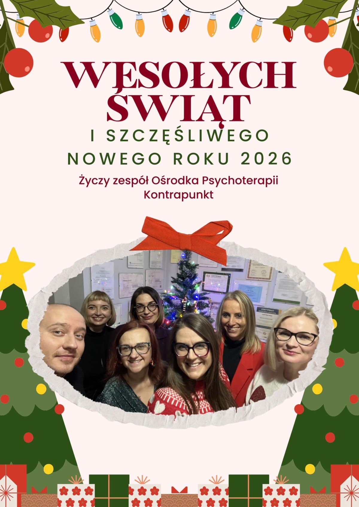 Ośrodek Psychoterapii Kontrapunkt to miejsce gdzie nie tylko prowadzimy psychoterapię, warsztaty i szkolenia, ale także miejsce, w którym tworzymy zgrany i lubiący się zespół. Dbamy o swoje relacje, wspieramy się i pomagamy sobie wzajemnie. Dziś na świąteczne spotkanie nie udało się dotrzeć pani Justynie i pani Kindze, pozdrawiamy je zatem serdecznie. A wszystkim państwu przesyłamy przedświąteczne życzenia dbania o siebie, bliskości i życzliwości ❤️